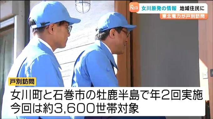 東北電力による戸別訪問は、女川原発が立地する女川町と石巻市の牡鹿半島で年に2回行なわれています。今回は、約3600世帯を対象に12月22日まで実施されます。