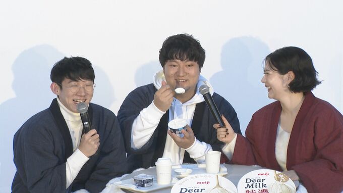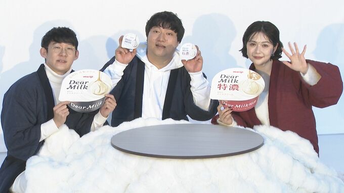 3人は、暖かそうなちゃんちゃんこを身につけ、こたつに入りながらトーク。ロングコートダディは明治 Dear Milkのアイスクリームの食リポ対決に挑戦しました。