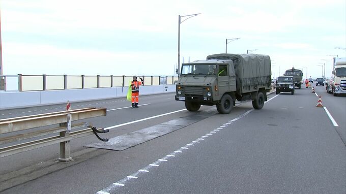 緊急車両が走行する道を確保するため、自衛隊と連携して中央分離帯のガードレールを手作業で外すなど、下り車線に車を通す手順を確認しました。