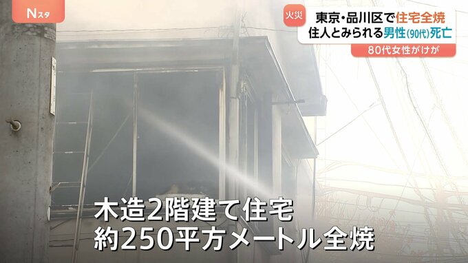きょう昼すぎ、東京・品川区の住宅が全焼する火事があり、住人とみられる90代の男性が死亡しました。「西品川の住宅街で火災です。煙が上がっています」きょう午後0時30分すぎ、東京・品川区西品川の2階建て住宅で…