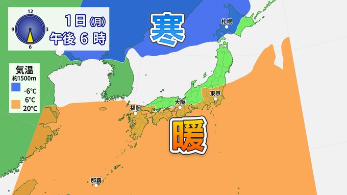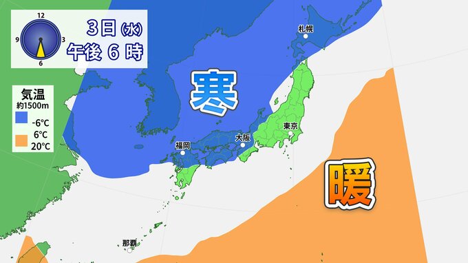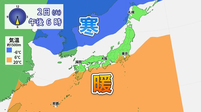 きょう1日は東日本以西を季節外れの暖気が覆っていますが、あす2日になると次第に暖気が後退し、北から寒気が南下してくる見込みです。3日になると、マイナス6℃(平地で雪の目安)の強い寒気が西周りで南下するでしょう。これは、わずか数日の間に季節が大きく進むことを表しています。