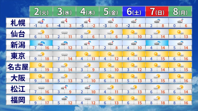あす2日(火)の日中まではまだ暖かいですが、3日(水)以降は全国的に真冬のような寒さとなるでしょう。風も強まり、体感温度は気温よりも低くなりそうです。札幌では4日(木)、気温が1日を通して0℃未満の「真冬日」が予想されています。