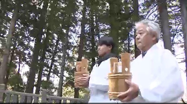 戸隠神社の中社で、白装束の男性が二人が捧げ持つのは、1日朝、黒姫山の登山道にある池から汲んできた、雪乞いにご利益があるとされる水です。