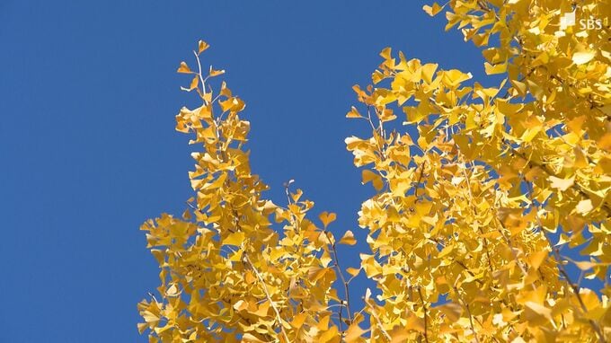 久留嶋予報士が思わず声を上げたのは、公園内を彩るイチョウ並木。すっきりと晴れ渡った青空の下、イチョウの黄色が鮮やかに映え、美しいコントラストを描いていました。