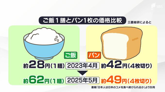 現在、パン1枚とご飯1膳の価格が逆転しています。2023年はご飯1膳が、食パン1枚と比べて14円安かったのが、コメの価格高騰によって、2025年はコメがパンより13円高くなったという研究結果も出ています。