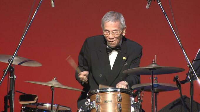 ドラマーの金城吉雄さん。16人編成の「YKシンギンオーケストラ」を率いるバンドリーダーです。吉雄さんと悌子さんは、那覇高校時代の同級生。