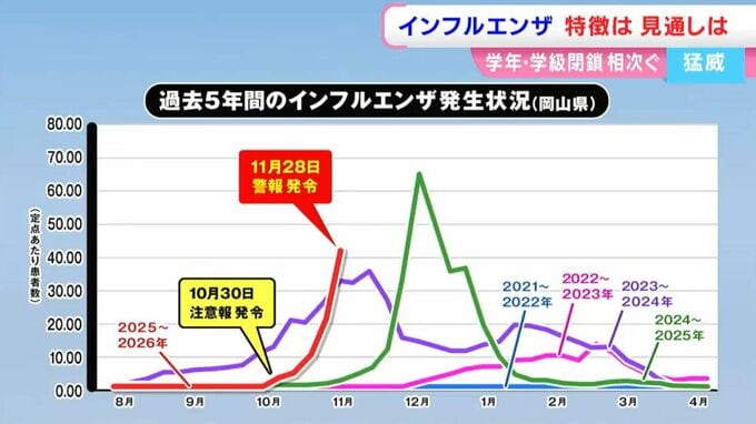 インフルエンザの患者が急増し岡山県では先週(11月28日)警報が出されました。岡山・香川では100以上の施設で、きのう(12月1日)学年・学級閉鎖が発表されるなど子どもたちの間で主に感染が広がっています。今年の特徴や収束の見通しについて医師に聞きました。