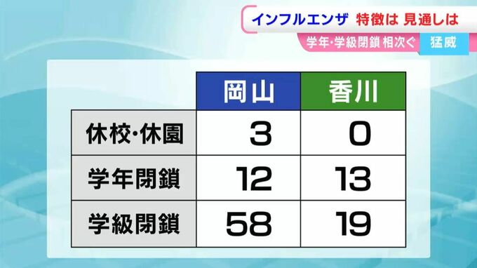 幼稚園・保育園や小・中・高校のうち、岡山では3つの施設できょう、休校・休園が発表されました。また学年閉鎖は岡山で12・香川で13。学級閉鎖は岡山で58・香川で19となっています。