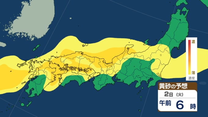 気象庁の発表する「黄砂解析予測図」や、「黄砂の予想シミュレーション」を見てみると、12月1日(月)から西日本を中心に広い範囲にかかっていた“黄砂の影”は、2日(火)の夜にかけて西日本や東日本の一部を覆う見込みです。
