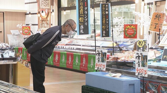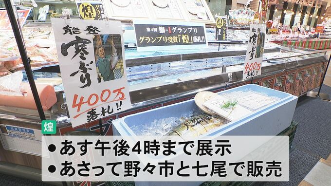 競りの後、400万円の「煌」は、どんたく野々市中央公園店へ。鮮魚売り場に設けられた特設コーナーにお目見えした立派なブリに、買い物客も思わず足を止めます。