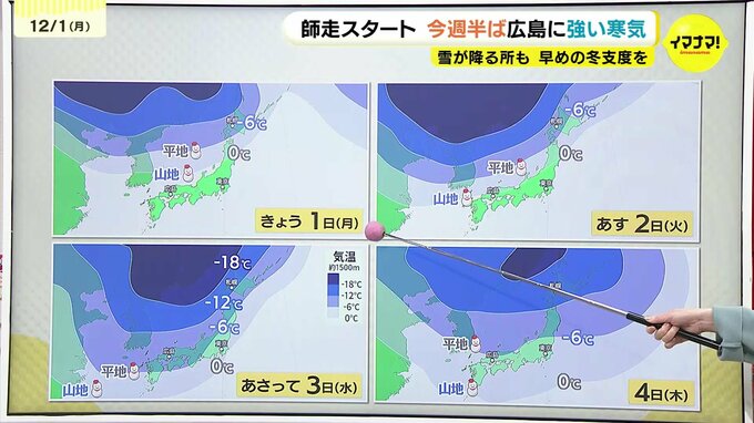1日に季節外れの高温となった理由は、上空に寒気が入っておらず、この時期としては暖かい空気に覆われているためです。上空1500m付近の気温を見てみると、山地で雪を降らせる目安の0℃が、1日は北日本にのみかかっていますが、2日には広島県にかかり始め、3日には日本列島をすっぽり覆う見込みです。3日は、この寒気のピークとみられ、平地で雪を降らせる目安の-6℃以下の寒気が流れ込む予想です。そのため、3日(水)から4日(木)にかけて、山地を中心に今シーズン初のまとまった雪となり、平地でも積雪となる可能性があります。積雪や路面の凍結にご注意ください。