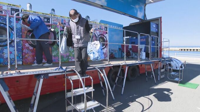 また、コインランドリー事業を展開するWASHハウスの移動式ランドリー車が11月28日から派遣されています。県と10月に結んだ災害時の協定に基くもので、車両には大型の洗濯機と乾燥機あわせて6台が搭載されています。