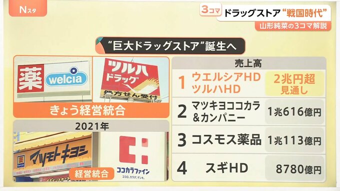 12月1日に統合したのは、ドラッグストア業界1位「ウエルシアHD」と業界2位「ツルハHD」で、売上高は2兆円を超える見通しだということです。