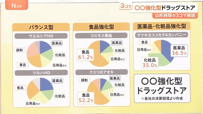 ドラッグストア業界各社の決算には、品目別の売り上げがあるのですが、そこから大きく分けて“3つの特色”が見えてきます。