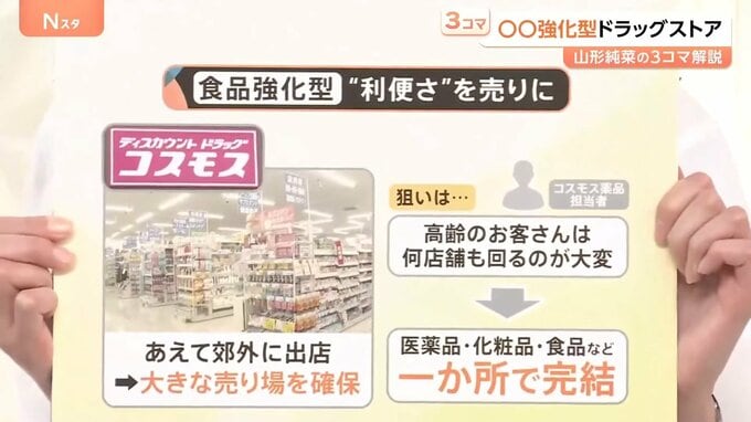 その狙いについて、コスモス薬品の担当者は、高齢のお客さんは何店舗も回るのが大変なため、医薬品・化粧品・食品など“一か所で完結”できるようにしているといいます。