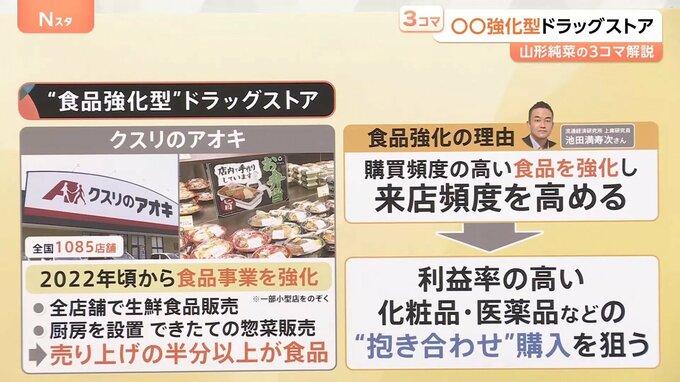 小売業の流通に詳しい流通経済研究所・上席研究員の池田満寿次さんは、購買頻度の高い「食品」を強化し、来店頻度を高める。そして、利益率の高い化粧品・医薬品などの“抱き合わせ”購入を狙っているのではないかとしています。