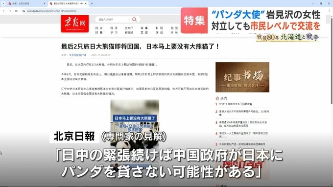 中国紙は、日中の緊張が続けば、上野動物園の2頭返却後、中国政府がパンダを貸さない可能性があるという有識者の見解を報じました。