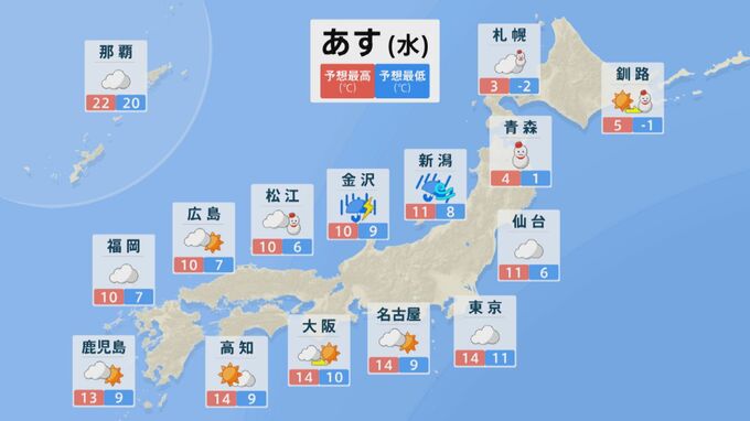 全国的に、3日の午後から厳しい冷え込みになるところが多いでしょう。3日は朝出かける段階から厚手の上着を持参したほうがよさそうです。体調管理などに注意をしてください。日本海側では雪による交通障害などに注意・警戒が必要です。