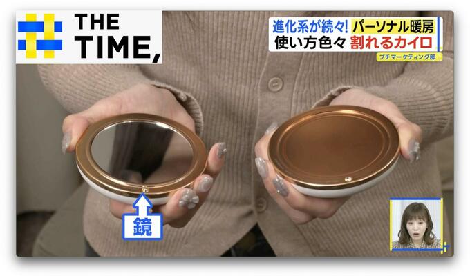 円形2重構造の「充電式シェアカイロ モバイルバッテリー機能付」(mottole/4630円※グレー・ホワイトの2色展開)は、割ると内側の面が“鏡”になっているので、お化粧直しにも便利です。
