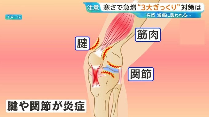 急な冷え込みにより膝の筋肉が硬くなると、骨へと繋がる腱(けん)がひっぱられ、腱や関節が炎症を起こし、膝に激痛を引き起こすと考えられています。