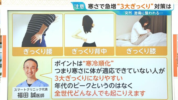 整形外科医の福田誠医師によると、寒さに体が適応できていない人が“3大ぎっくり”になりやすく、全世代、どんな人でも起こり得るといいます。
