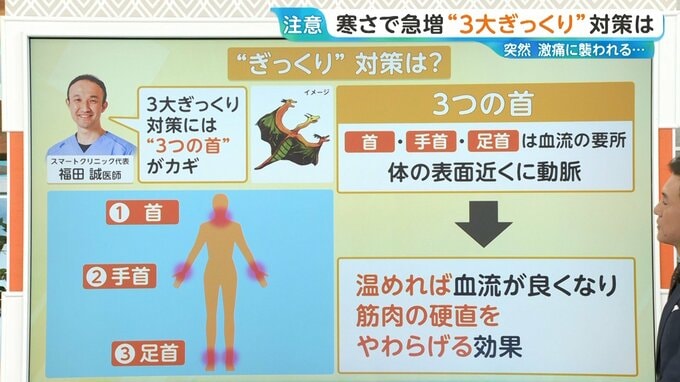 この「3つの首」を温めることで血流が良くなり、筋肉の硬直を和らげる効果があります。