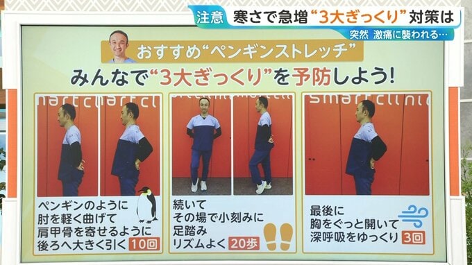 【1】手を後ろで軽く組んで、ペンギンのようにひじを軽く曲げる。肩甲骨を寄せるようにひじを前後に大きく動かす(10回)