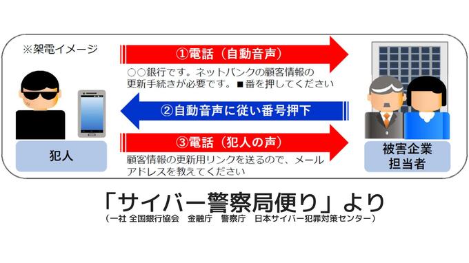 この詐欺は、銀行関係者をかたり企業や個人に電話をかけ、インターネットバンキングのIDやパスワードを巧みに盗み出し、口座から現金を不正に送金するものです。