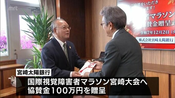 今月14日に宮崎市で青島太平洋マラソンと同時開催される「視覚障害者マラソン宮崎大会」に役立ててもらおうと、金融機関から協賛金が贈られました。2日は宮崎市役所で贈呈式があり、宮崎太陽銀行の黒木 浩 頭取か…