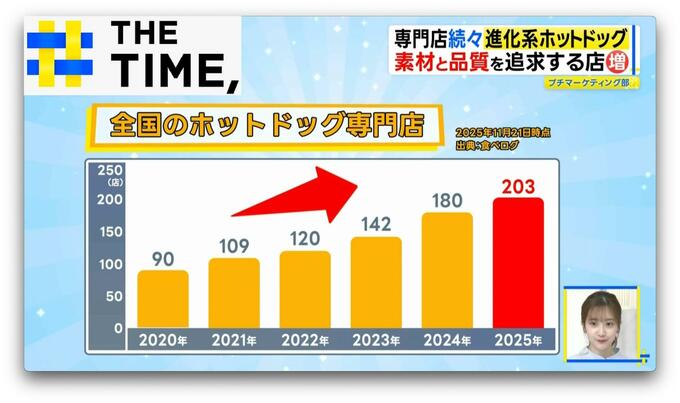 グルメサイト『食べログ』の調査では、全国のホットドッグ専門店は【2020年:90店】⇒【23年:142店】⇒【25年:203店】と年々増加。(※25年11月21日時点)