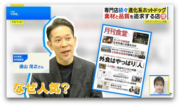 「客は今すごく“タイパを意識する”。ホットドッグはソーセージをパンに挟むだけなので提供スピードを上げられる。そこにどう付加価値をつけるか。トッピングを盛り盛りにしたり、シンプルなだけに素材を追求して品質を上げていく“進化系ホットドッグ”がきている」