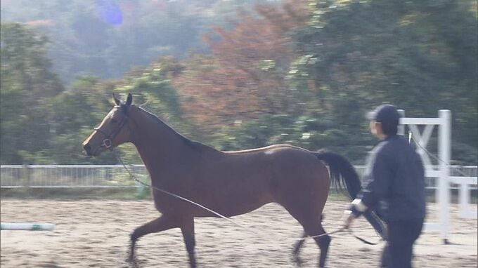 インストラクターに手綱をひかれ、広いグラウンドを気持ちよさそうに走るのはマーブルカリクロ号・4歳。今年3月まで競走馬として活躍し、引退したばかりの馬です。