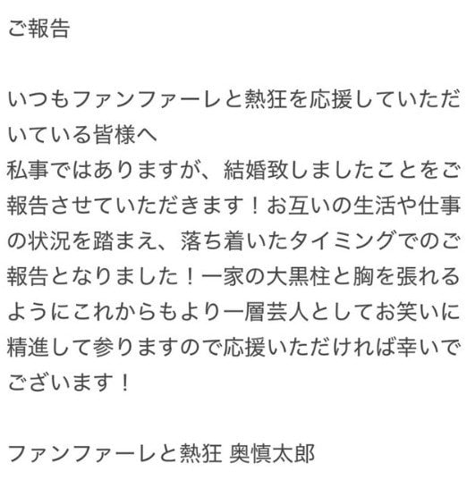 お笑いコンビ「ファンファーレと熱狂」の奥慎太郎さんが、自身のXで結婚したことを発表しました。