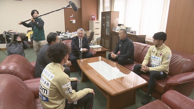県庁を訪れたのは、いわきFCの田村雄三監督や尚志高校出身の五十嵐聖己選手、加瀬直輝選手などです。J2昇格3年目となったいわきFCは、11月29日の最終戦で、五十嵐選手のゴールでベガルタ仙台を1ー0で破り、9位で今シーズンを終えました。