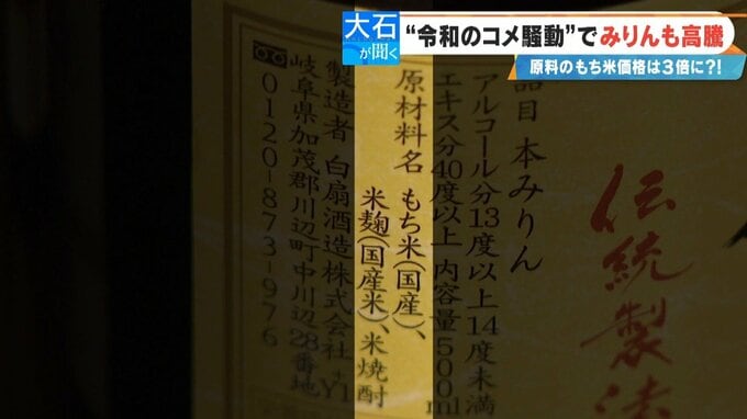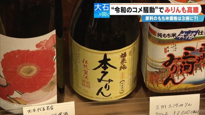 そして、お餅も高騰。もち米の値段は去年の約2倍と銘柄米を超える上がり幅に。その影響で同じく高騰しているのが、和食の味に欠かせない「みりん」です。