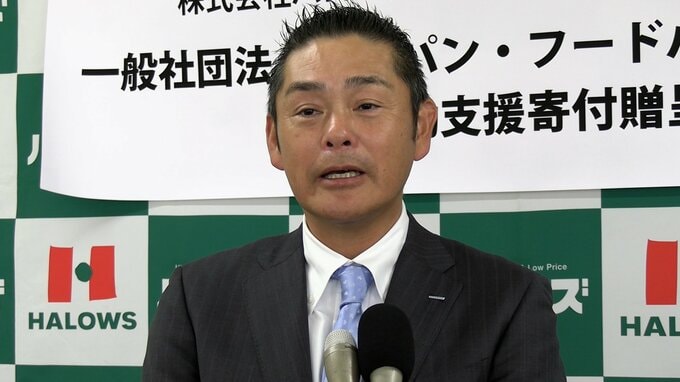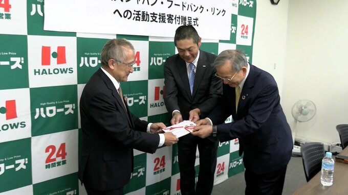 生活困窮者を支援するフードバンクに役立ててもらおうと、スーパーマーケットのハローズなどが寄付金を贈りました。