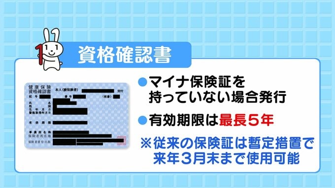 こういった懸念や、そもそもマイナンバーカードを持っていない方などが代わりに使うのが「資格確認書」です。形や大きさは加入している保険組合によって変わるので、画像は一例となります。資格確認書は、マイナンバーカードを健康保険証として利用していない人に対し、従来の保険証の代わりとして発行されるものです。つまり、マイナ保険証を持たない場合でも、この資格確認書があれば、引き続き医療機関で保険診療を受けられます。有効期間は最長で5年です。