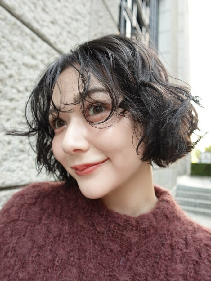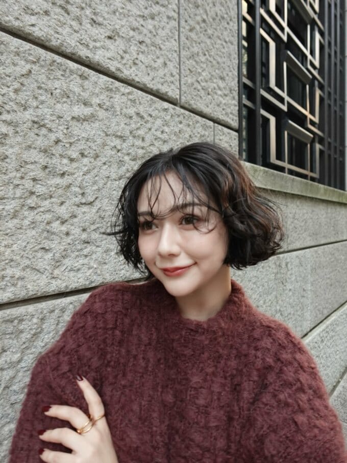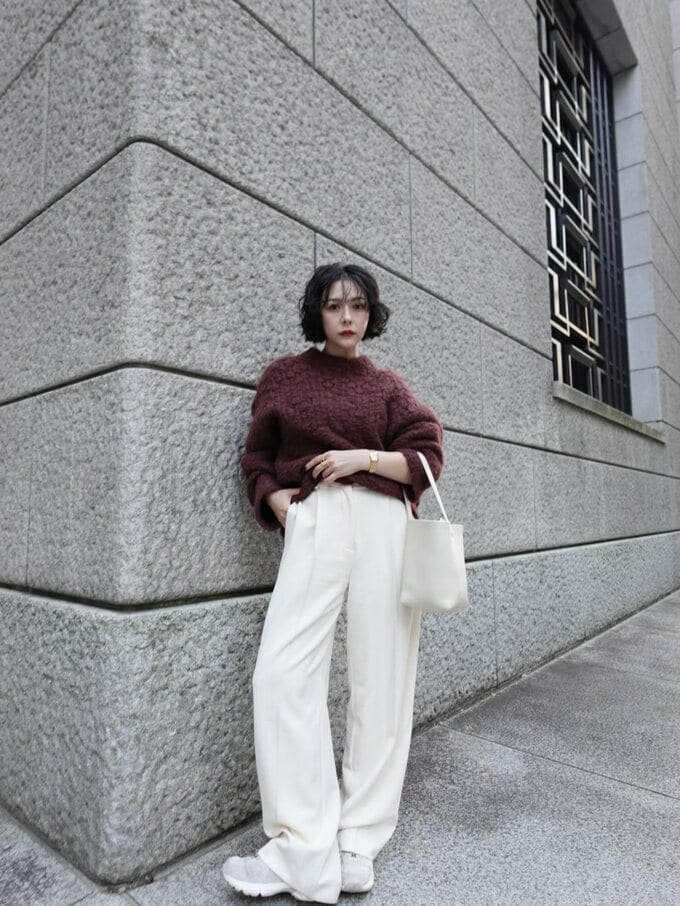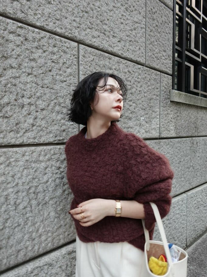 村重さんは「髪の毛アップ写真から失礼します!村重です!」と元気良くテキスト。投稿した写真は、ざっくりと動きをつけたウェービーなボブカットにワインレッドのニット、そして白のワイドパンツとスニーカーを合わせた、温かそうで軽やかな装い。リップが映えるスマイルを見せています。