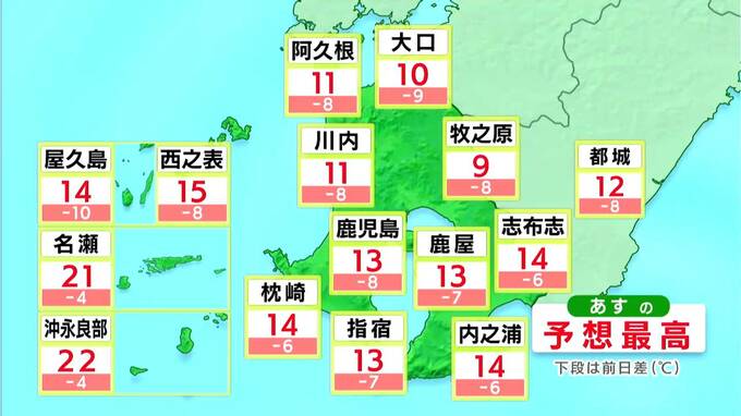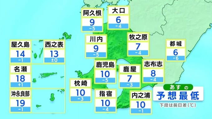 あす3日の予想最低気温です。薩摩、大隅、種子島、屋久島は2日朝より5度近く下がるでしょう。しかし、朝の気温はそれほど低いわけではありません。