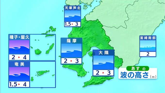 3日の波は強い風のため、種子屋久、奄美はのち4メートルとしけるでしょう。船便に影響が出そうです。