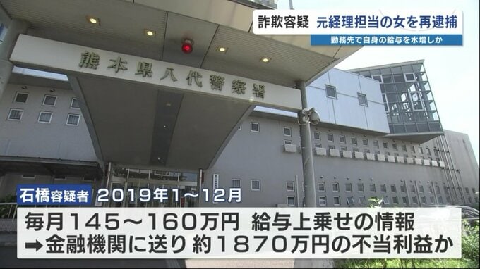 金融機関にうその手続きをして自身の給与を水増ししたとして、経理担当だった女が再逮捕されました。電子計算機使用詐欺の疑いで再逮捕されたのは、熊本県宇土市松山町の無職、石橋明美容疑者(57)です。石橋容疑者…