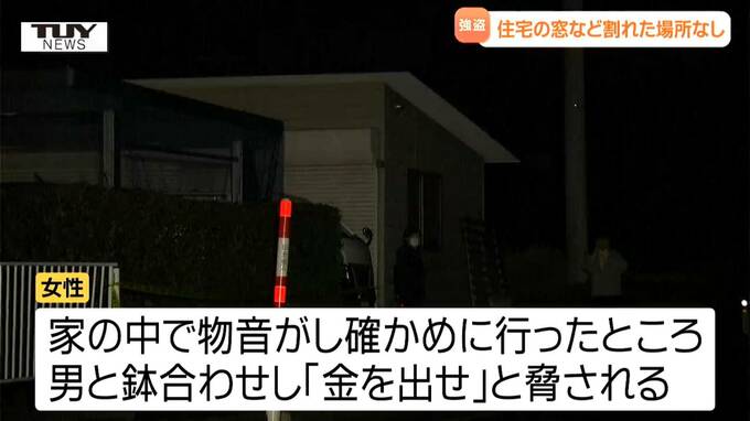 警察によりますと、当時、女性が家の中で物音がしたため確かめに行ったところ、男と鉢合わせし「金を出せ」と脅されたということです。