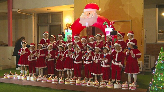 1日は年長の園児23人がハンドベルできらきら星を演奏。この後、みんなでジングルベルの歌を歌ってクリスマス気分を味わいました。園では毎年イルミネーションの数を増やしていて今年はおよそ3万球が飾られました。