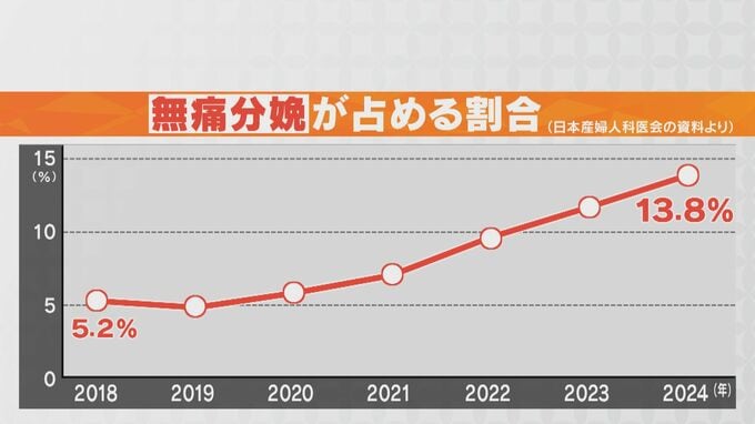 日本産婦人科医会の調査によると、2024年全国で行われた出産のうち、無痛分娩の割合は13.8%と6年間で2.7倍に増えています。