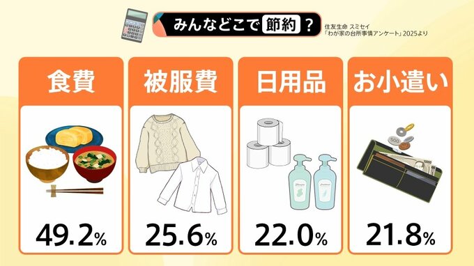 みなさん、どのように節約しているのでしょうか。アンケートによると、食費や被服費を抑えているという回答が多かったことが分かります。