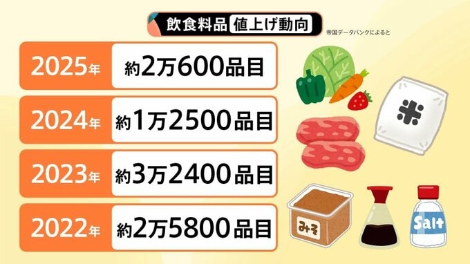 さかのぼってみると、2023年が約3万2400品目となっています。2023年は中東情勢やウクライナ侵攻などがあり、値上げ品目が多くなったとみられています。