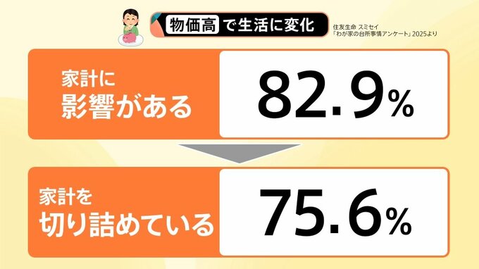 住友生命が行ったアンケートによると、物価高で「家計に影響がある」と回答したのが82.9%。さらに、「家計を切り詰めている」と回答したのは75.6%にのぼりました。物価高で生活に変化があったことが分かります。