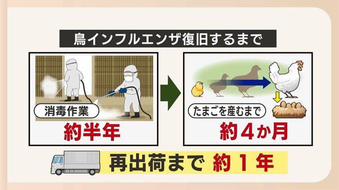 「我々にとって一番苦しいのは、やっぱり鳥インフルエンザですね。2年前も今年もですね、(価格高騰の)原因は鳥インフルエンザで、にわとりを全部殺処分して、それから半年ぐらいは消毒を繰り返さないといけない。元に戻るには、どう考えても1年ぐらいかかるので、たまごの不足は続くでしょうね」