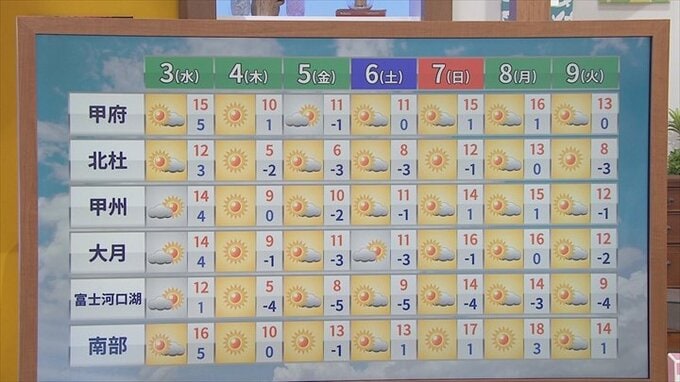 今後寒さがずっと続くのか、まずあさって4日木曜日。最高気温でも北杜市大泉、富士河口湖町で5℃予想。これは1月中旬並みの寒さとなります。