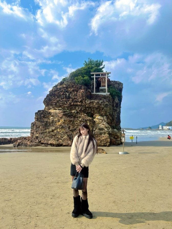 稲佐の浜では、ベージュのファーのジャケットに黒のスカート、黒の厚底ブーツというコーディネートで、リラックスした休日を楽しむ写真を添えています。